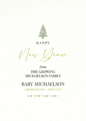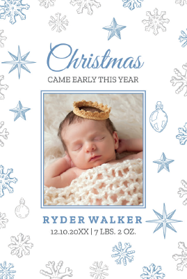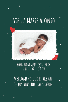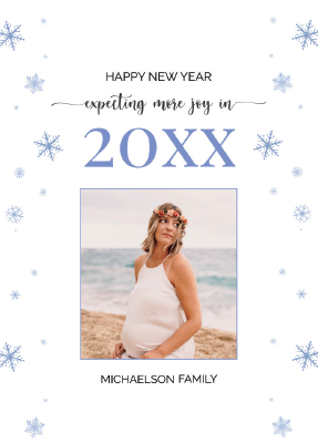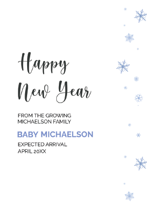 If your baby hasn’t arrived yet, you can send a pregnancy announcement Christmas card or a New Year’s pregnancy announcement. Add your pregnancy photos to the template, which has a simple snowflake pattern.