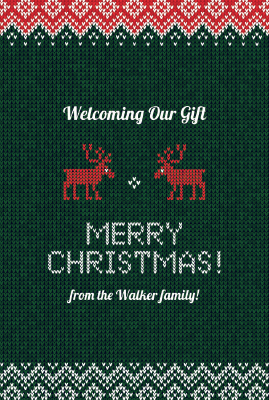 This festive holiday postcard template features a knit sweater pattern. The cute design will make your winter baby look extremely cozy. The back of the template has text that mimics knit wording, as well as two reindeer.