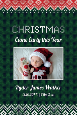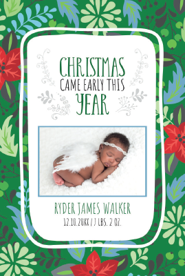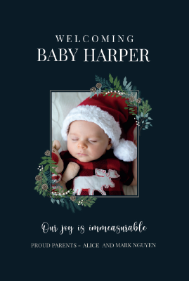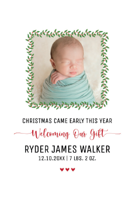 This elegant birth announcement card places your cute baby photo in the center. A festive garland borders your photo, which you can upload using GotPrint’s online designer. On the back, there is more space for a holiday greeting from your expanding family.