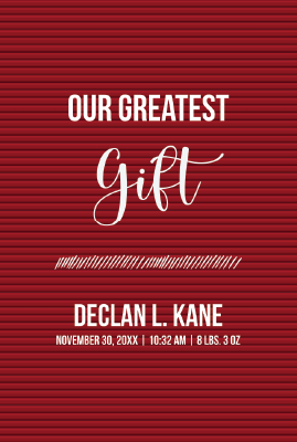 Upload a photo to the background of this holiday birth announcement template, then edit the text on the front to share your baby’s name, birthday, and other exciting details. The other side, which is available in red, green, and black, features a Santa hat and a Christmas present.