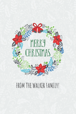If you’re not into traditional Christmas visuals, use this fun tropical pattern instead. The vibrant colors are available in green, orange, and purple color palettes. The back features a fun wreath made of tropical flowers.