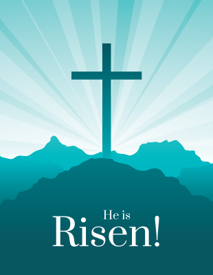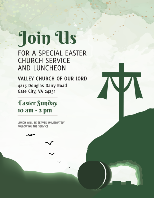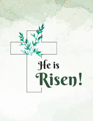 This Easter Sunday flyer invites people to join your service that day. If you’re planning something special, like an Easter egg hunt or luncheon, make sure to share it on the flyer. The front of the flyer has a cross and says “He is Risen,” and the back has a shrouded cross, open tomb, and flying birds.