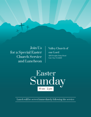 Available in blue, yellow, and purple, this Easter flyer template features the sun shining behind a cross on a hill. On the back of this double sided flyer, add all the information for your Easter service.
