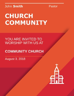 This orange and red flyer features an engaging striped pattern with a simple church icon. Add your church name in large text at the top, then add your invitation to worship elsewhere on the flyer. Put your church website, address, phone number, and email on the other side.