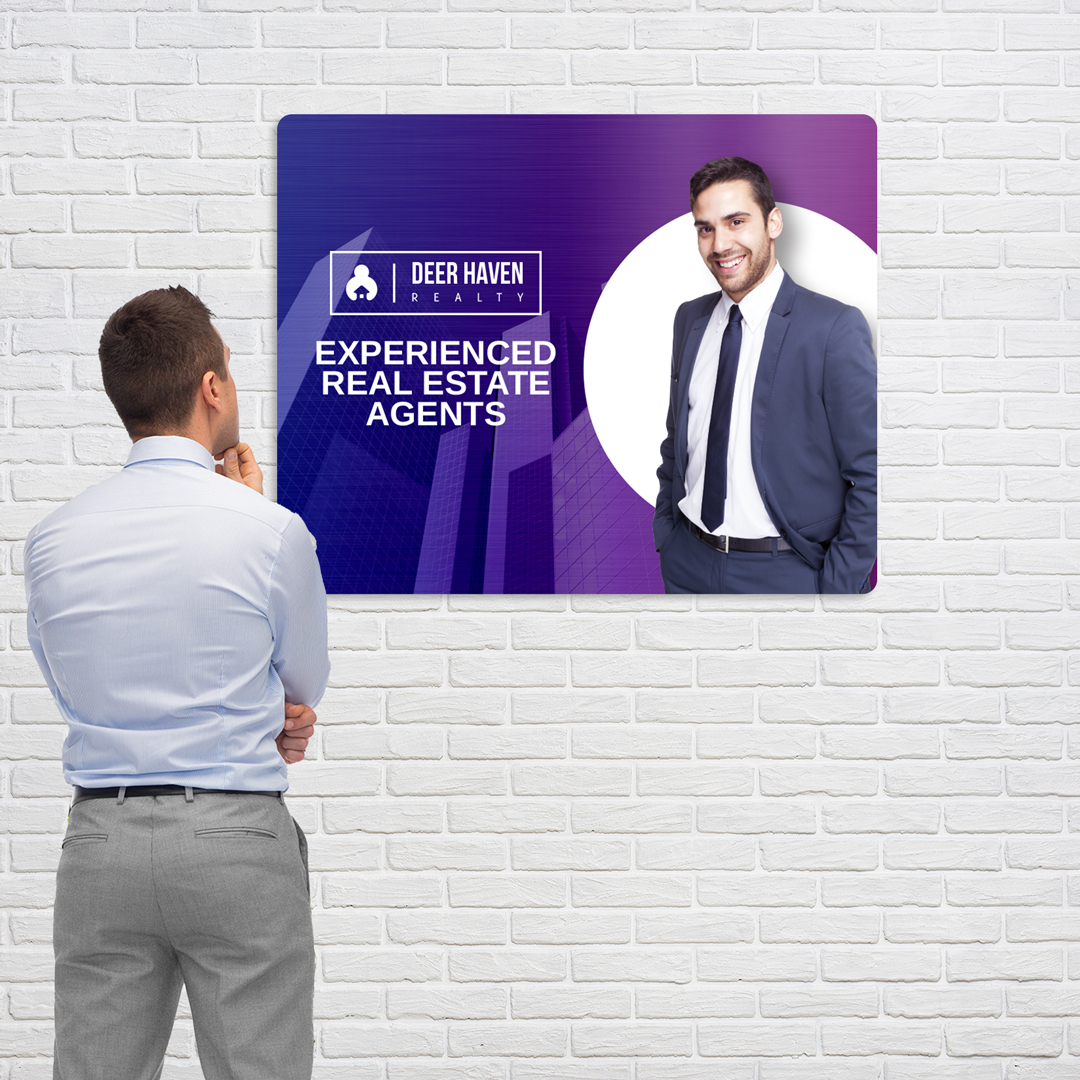Hang custom aluminum signs at your listed properties. The durable metal signs are ideal outdoor signs that you can display directly on the building. The brushed aluminum surface has a polished finish that sets your agency above the rest. Investing in these sleek custom metal signs shows your clients that your agency is high-end and professional.