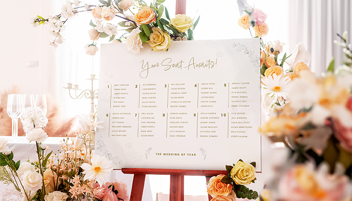 Seating charts should be 24” x 36”. A seating chart needs to be large enough for every name and table to be legible, especially if you have a lot of guests. A more intimate wedding with fewer guests can use a smaller sign size. Regardless, make sure the font and text color are easy to read.